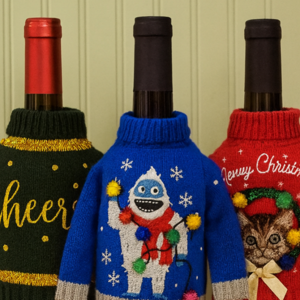 Say hello to the cutest (and coziest!) way to gift a bottle this season — our Holiday Wine Sweater Collection!
